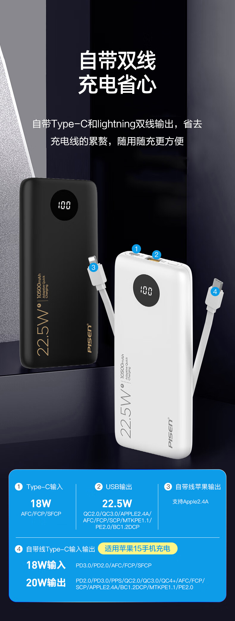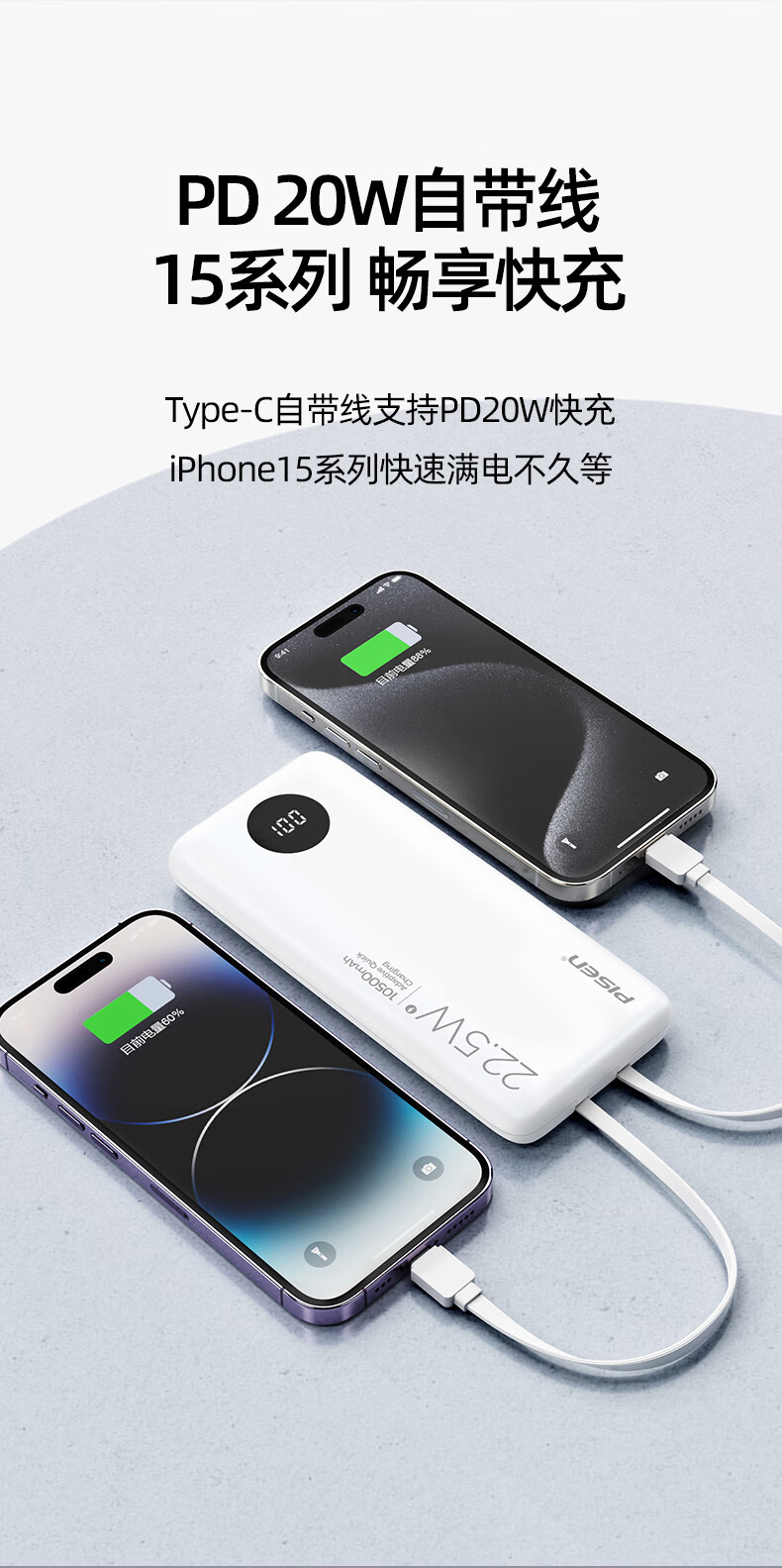 > 10500mAh充电宝 自带苹果/Type-C线