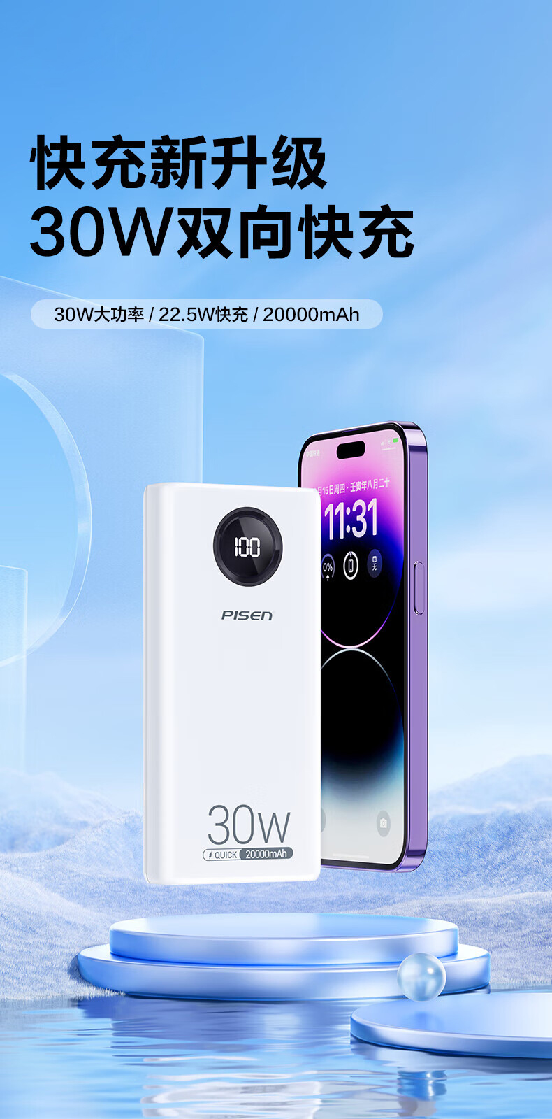> 20000mAh充电宝 30W双向快充